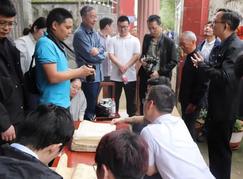 调查团队在南溪乡垇背周氏族人家中拍摄族谱