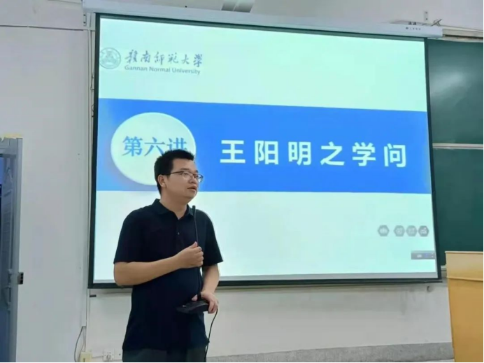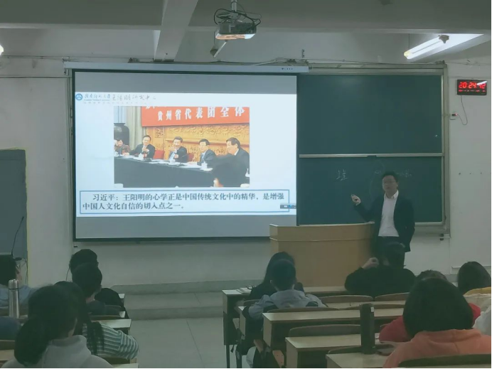 陈涛老师主要讲授《概述:千古一人王阳明》《阳明心学之致良知》《泰州学派》等内容,让学生了解王阳明的生平经历、“致良知”的内涵、阳明后学之泰州学派的主要人物及主要思想等内容。其中,“致良知”的内涵是非常重要的内容,《明史·王守仁传》载:“其为教,专以致良知为主。”“致良知”是王阳明晚年论学的宗旨,这三个字既简易直截又内涵丰富,将王阳明的整体哲学思想完整地表述出来,标志着阳明心学建构的最终完成。