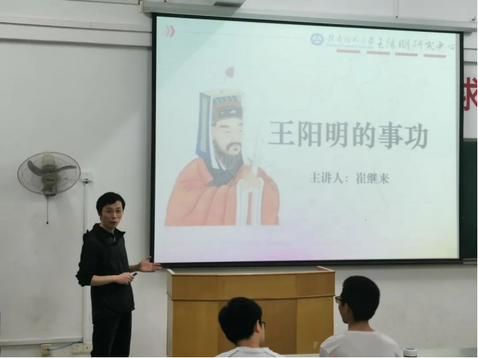 崔继来老师讲授的内容是《王阳明的事功》,王阳明的事功主要体现在以下三个方面:一、平定困扰明朝多年的江西、湖广、福建、广东交界地区的贼寇和流民动乱;二、平定宁王朱宸濠叛乱,有效地维护了国家统一;三、平定广西思恩府、田州府土司叛乱,稳定了西南边疆,为以后的改土归流积累了经验,也为民族融合创造了条件。因为这些功绩,王阳明被封为新建伯。隆庆元年四月,明穆宗下诏追赠王阳明为新建侯,谥文成,赐祭七坛。清修《明史》对王阳明有高度评价:“终明之世,文臣用兵制胜,未有如守仁者也。”