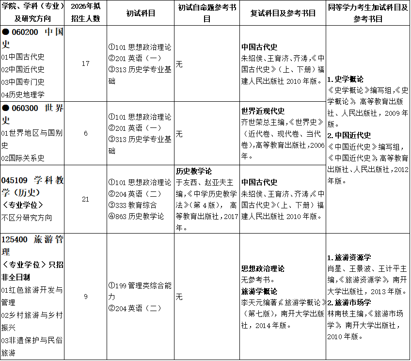 学院设有中国史、世界史2个一级学科硕士点,以及学科教学(历史)、旅游管理2个专业硕士点;开设历史学、旅游管理2个本科专业。历史学为国家特色专业、教育部首批综合改革试点专业、江西省品牌专业及一流建设专业,并通过教育部师范专业二级认证;旅游管理为国家一流建设专业、省四星级专业。学院建有《中央苏区史》《世界当代史》《走进王阳明》等国家级、省级金课10余门,拥有“历史学专业教学团队”“赣南区域史课程群教学团队”2个省级高水平教学团队。