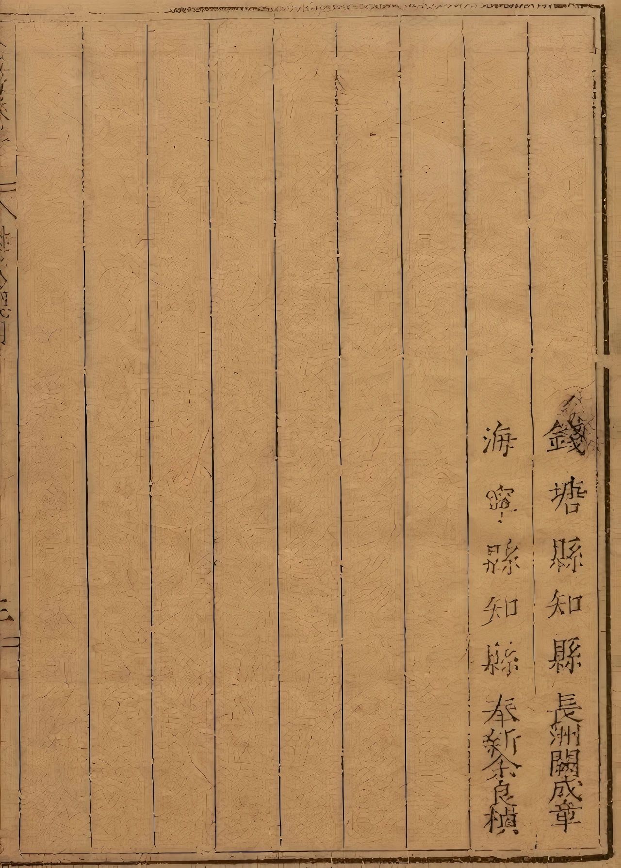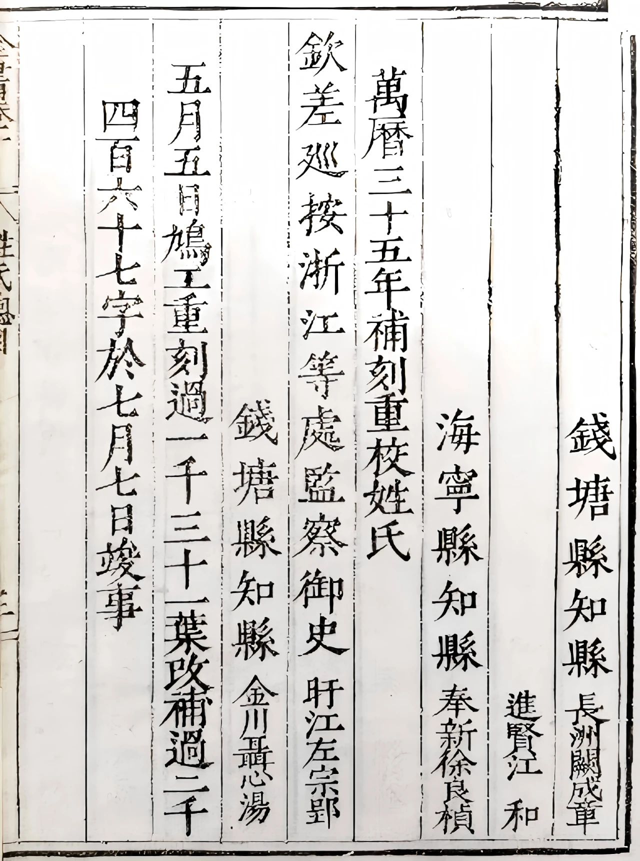 公文书馆本与普林斯顿本属此种印本,其中公文书馆本印次稍早。公文书馆本保存较为完整,普林斯顿本缺少徐阶序文、诰命、小像,以及“姓氏总目”的叶三。公文书馆本该叶署“钱塘县知县长洲阙成章、海宁县知县奉新余良桢”(见图1)。