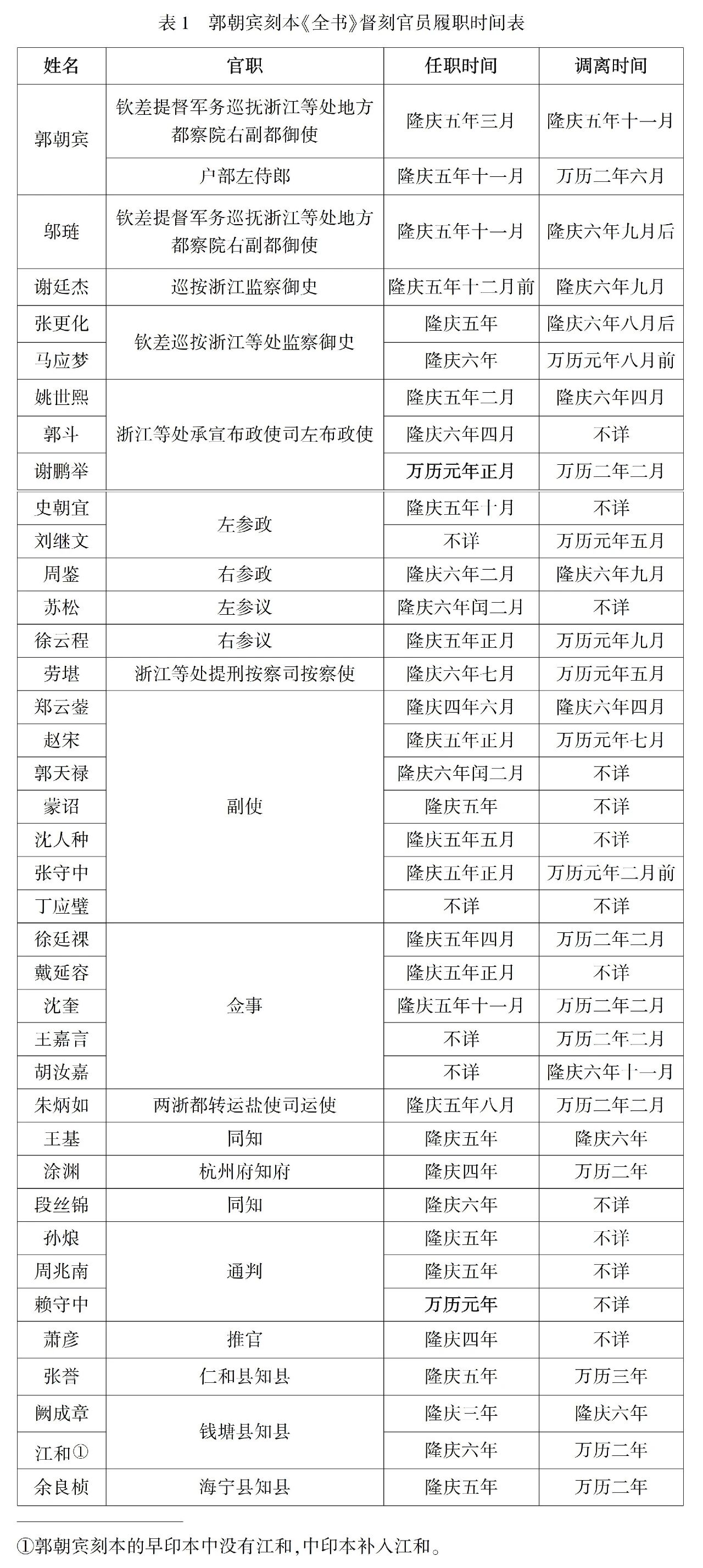 郭朝宾刻本“姓氏总目”中列有三十七名官员,涵盖了隆庆到万历之际杭州府上下各级部门。尽管某些官员可能并未参与实际刻书工作,但其履职时间与《全书》的刊刻过程应当有过交集,或全程都在任上,或中途调离,或中途来任。因此,《全书》刻成的时间应当晚于上述官员的就任时间,只有这样官员才有机会署名。现将“姓氏总目”所记三十七位官员的履职时间整理为表1: