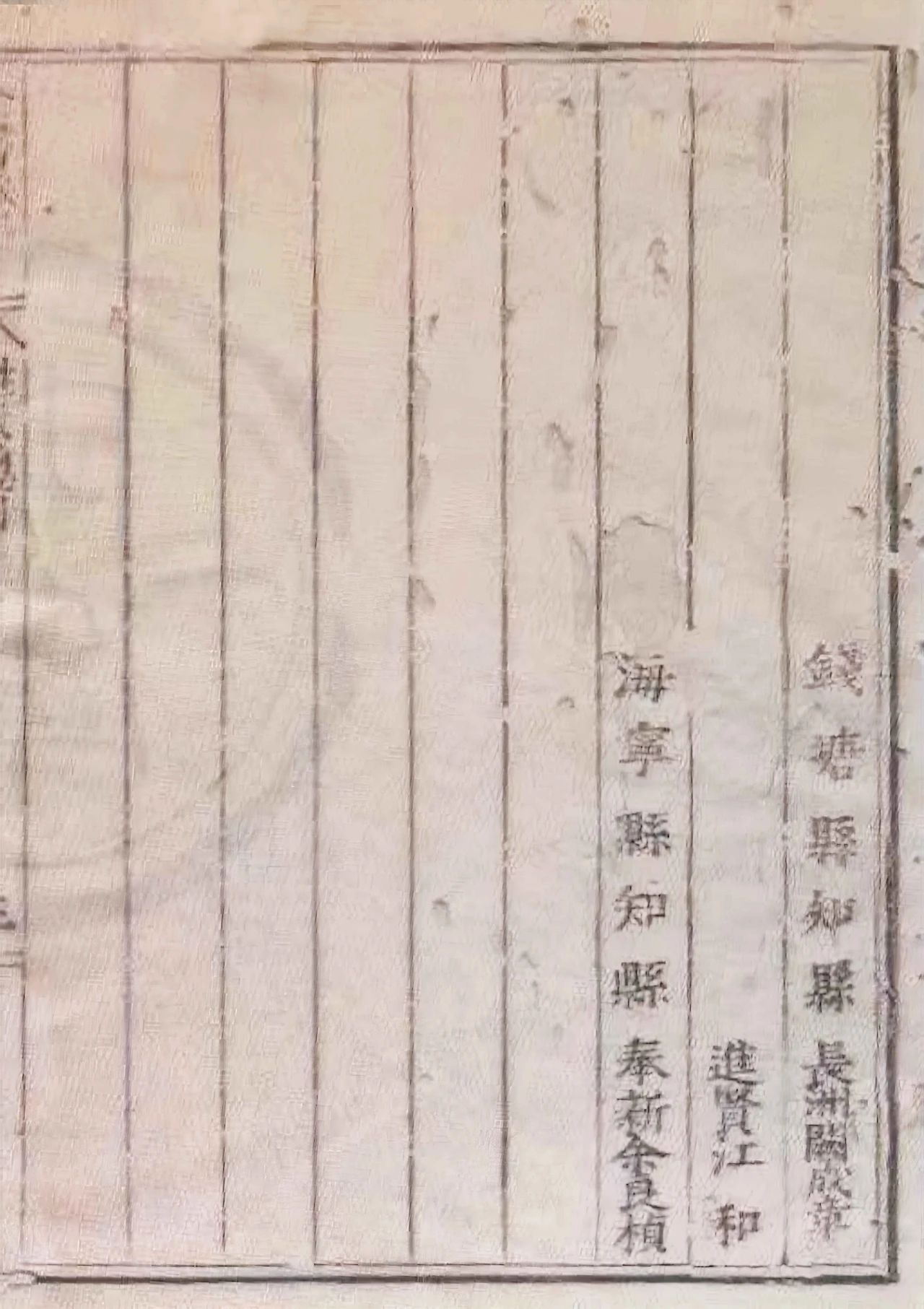 天一阁本和复旦本属此种印本,其中天一阁本印次稍早。复旦本保存较为完整,天一阁本仅存三十二卷。“姓氏总目”叶三,天一阁本与复旦本为修版,在“钱塘县知县长洲阙成章”一行后增加了“进贤江和”一行(见图2)。