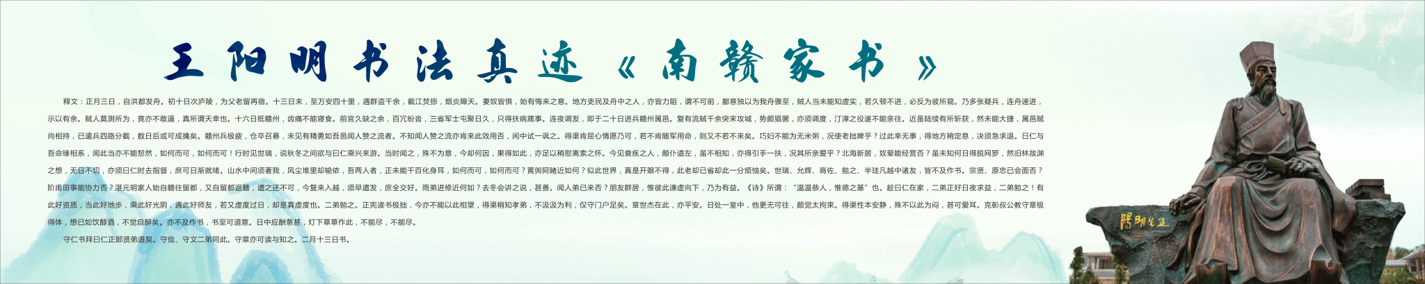 “秉烛心光·虔深论道”赣州阳明文化展展期为6月28日至8月30日。展览以“天地之心•知行之路”为主题,通过书画作品、文献资料与艺术装置,再现阳明先生在南赣的峥嵘岁月。展览分为四大板块:阳明文化遗址遗迹展区通过“立德、立功、立言”三个部分呈现平茶寮碑、通天岩题刻等历史遗存;王阳明书法及碑刻展区重磅展出王阳明《南赣家书》书法真迹,其笔锋苍劲间蕴藏“致良知” 哲思,让市民读者现场感受王阳明的书法魅力和思想情怀;阳明后学作品展区陈列历代文人以心学为灵感的书画佳作;新时代赣州阳明文化传承发展展区则通过学术研究、文明实践、文旅融合等板块,展现阳明文化在赣州传承发展的生动实践。展览处还同步播放首个以王阳明在南赣地区立德立言立功为主要内容的AI 动画,以科技手段活化历史场景,让观众沉浸式感受心学思想的形成脉络。《南赣家书》是王阳明的重要书法作品,具有极高的史料价值和艺术价值。《南赣家书》又名《与曰仁诸弟书》,写于明正德十二年(1517 年),是王阳明写给他妹夫徐爱及守俭、守文、守章诸弟的一封家书。信中记载着王阳明从南昌到赣州沿途的见闻,包括南赣复杂的匪情、他对匪情的担忧和初步剿匪情况,还提及因一路艰辛、水土不服,他“齿痛不能寝食”。